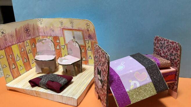 みんなの作品【Bコース審査員特別賞B】ドールハウス(ニックネーム:あんず さん) ニックネーム:あんず さん年齢:7 歳Bコース「未来の芸術家コース」コメント:リカちゃん人形の双子の妹、ミキマキちゃんの為のお部屋を作りたくて段ボールを使ってベッドと椅子を作ってみました。審査員コメント:色使いが繊細でとてもいいです。みんなの作品