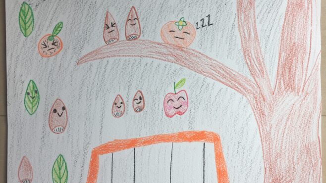 みんなの作品月夜のどんぐりパーティー(ニックネーム:えりりん さん) ニックネーム:えりりん さん年齢:7 歳Bコース「未来の芸術家コース」どんぐり達が夜の公園でこっそり遊んでいるところを想像して書きました。月でうさぎとどんぐりが餅つきをしていたり、ぶらんこに乗って楽しく遊んでいます。みんなの作品