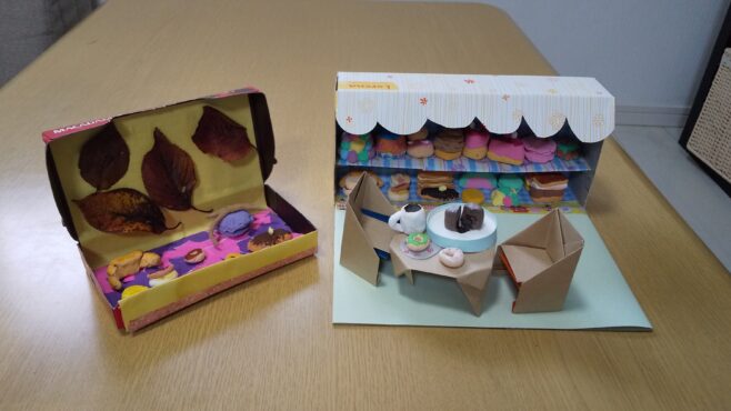 みんなの作品秋の姉妹カフェ(ニックネーム:あすかちゃん さん) ニックネーム:あすかちゃん さん年齢:7歳Bコース「未来の芸術家コース」コメント:ミニチュアのスイーツやパンが作りたいという7歳の娘。紙粘土を使っていろいろ作るのにはまっています。2歳の妹も側で折り紙をびりびりして一緒に作品作りを楽しみまし...みんなの作品