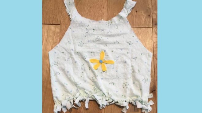 みんなの作品「TシャツをリメイクしてSDGsについて考えよう!」を見てつくってみました ニックネーム:あーさん年齢:9歳小さい頃着ていたTシャツで、エコバックをつくりました。Tシャツの模様と同じ色合いで花をつくって貼りました。みんなの作品