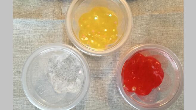 みんなの作品「スライムを作ってみよう!」を見てスライムをつくりました ニックネーム:ゆーさん年齢:9歳スライムをつくりました。赤、黄、黄緑、透明をつくってみました。黄緑は、食用色素の黄色と緑をまぜました。ラメとビーズを入れました。みんなの作品