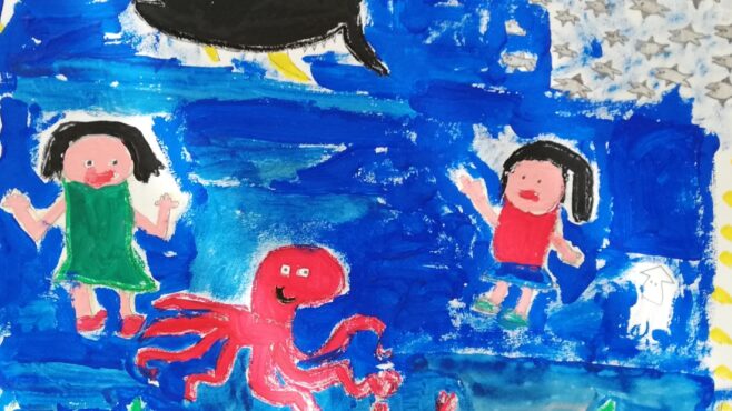 みんなの作品海と私たち(ニックネーム:しなな さん) ニックネーム:しなな さん年齢:9 歳Bコース「未来の芸術家コース」コメント:水族館に行った思い出が絵画のイメージになりました。青い海の中で友達と楽しく遊びました。みんなの作品
