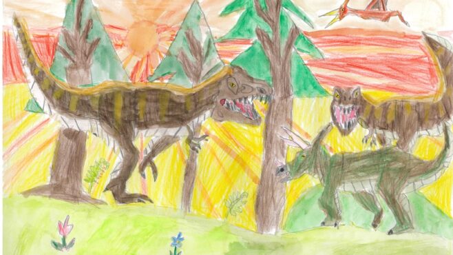 みんなの作品ティラノサウルス(ニックネーム:ゆうちゃん さん) ニックネーム:ゆうちゃん さん年齢:7 歳Bコース「未来の芸術家コース」コメント:今まで自分で描いた恐竜の絵と比べて、どれだけ上手になったのか、見てみたいと思っていました。そのタイミングでこのフェスタの話が来たので、頑張って描いてみました。...みんなの作品