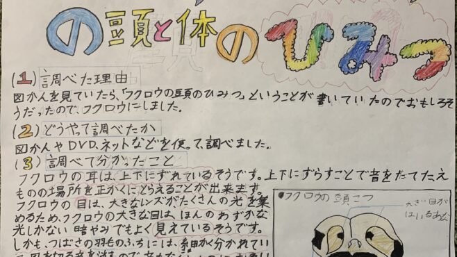 みんなの作品フクロウの頭と体のひみつ(ニックネーム:ひまりん さん) ニックネーム:ひまりん さん年齢:8 歳Aコース「未来の科学者コース」コメント:鳥が好きで、フクロウのことが気になり、図鑑なネットで詳しく調べたものをまとめました。みんなの作品