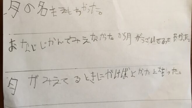 みんなの作品月の形と名前(ニックネーム:YMT さん) ニックネーム:YMT さん年齢:7 歳Aコース「未来の科学者コース」コメント:あるアニメの影響で、上弦の月、下弦の月とは何かに興味を持ちました。毎日決まった時間に夜空に浮かぶ月の形をスケッチし、その名前を調べて表にしました。曇などて見えなか...みんなの作品