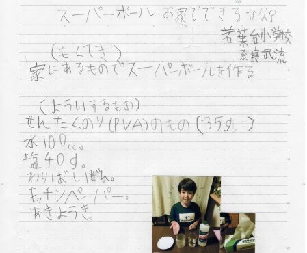 みんなの作品スーパーボールお家でできるかな?(ニックネーム:たけ さん) ニックネーム:たけ年齢:8 歳Aコース「未来の科学者コース」テレビアニメ(だがしかし)でスーパーボールを作っているものを見て、ほんとうに自分でも家でつくれるのかやってみました。家で、自分で、家にあるものでできるかどうかためしたかった。工作や...みんなの作品